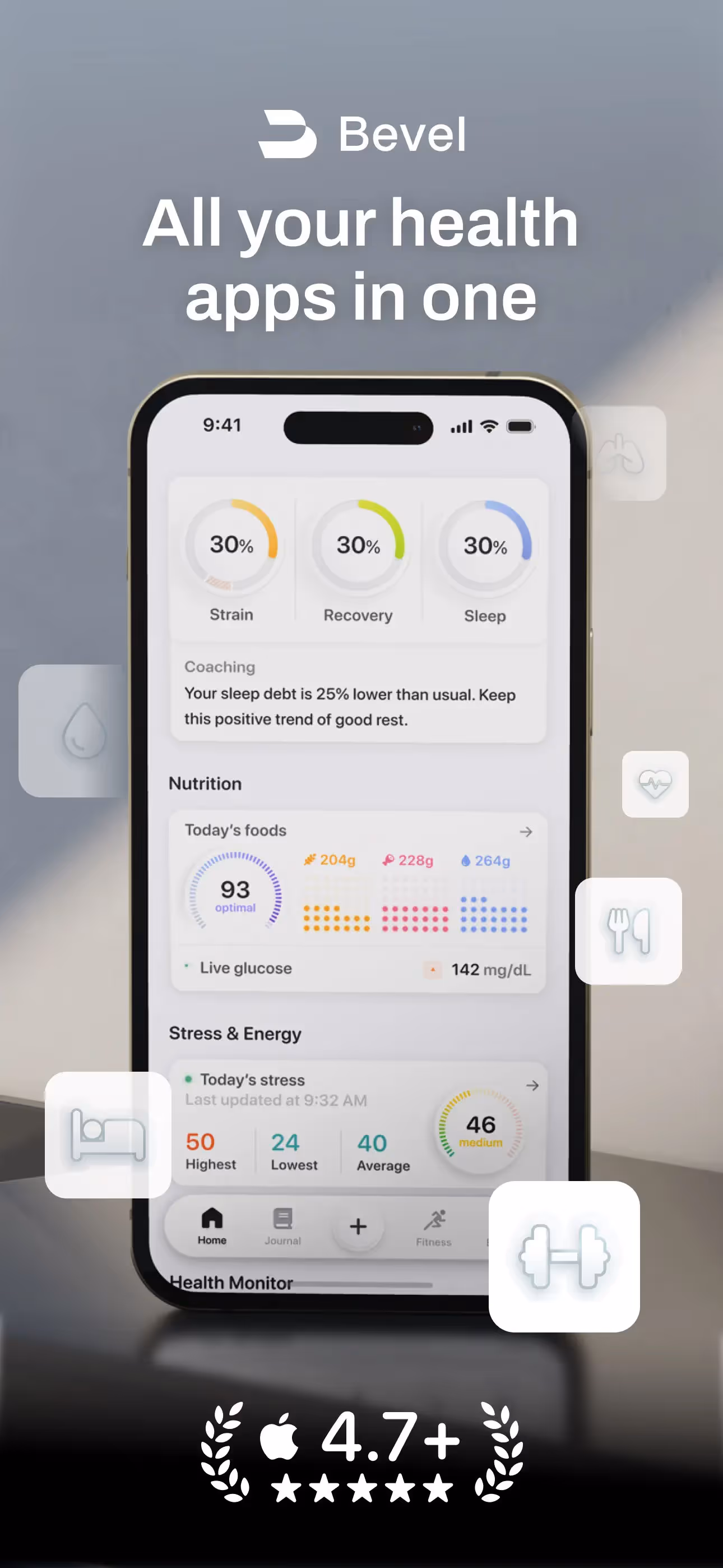 Bevel: Health & Performance is a Health & Fitness app developed by Finerpoint, Inc. Priced at Free, it currently holds a rating of 4.7/5 on the App Store. Browse through its curated screenshots for App Store Optimization (ASO) inspiration, UI design ideas, and to discover effective ways to present a Health & Fitness app visually.