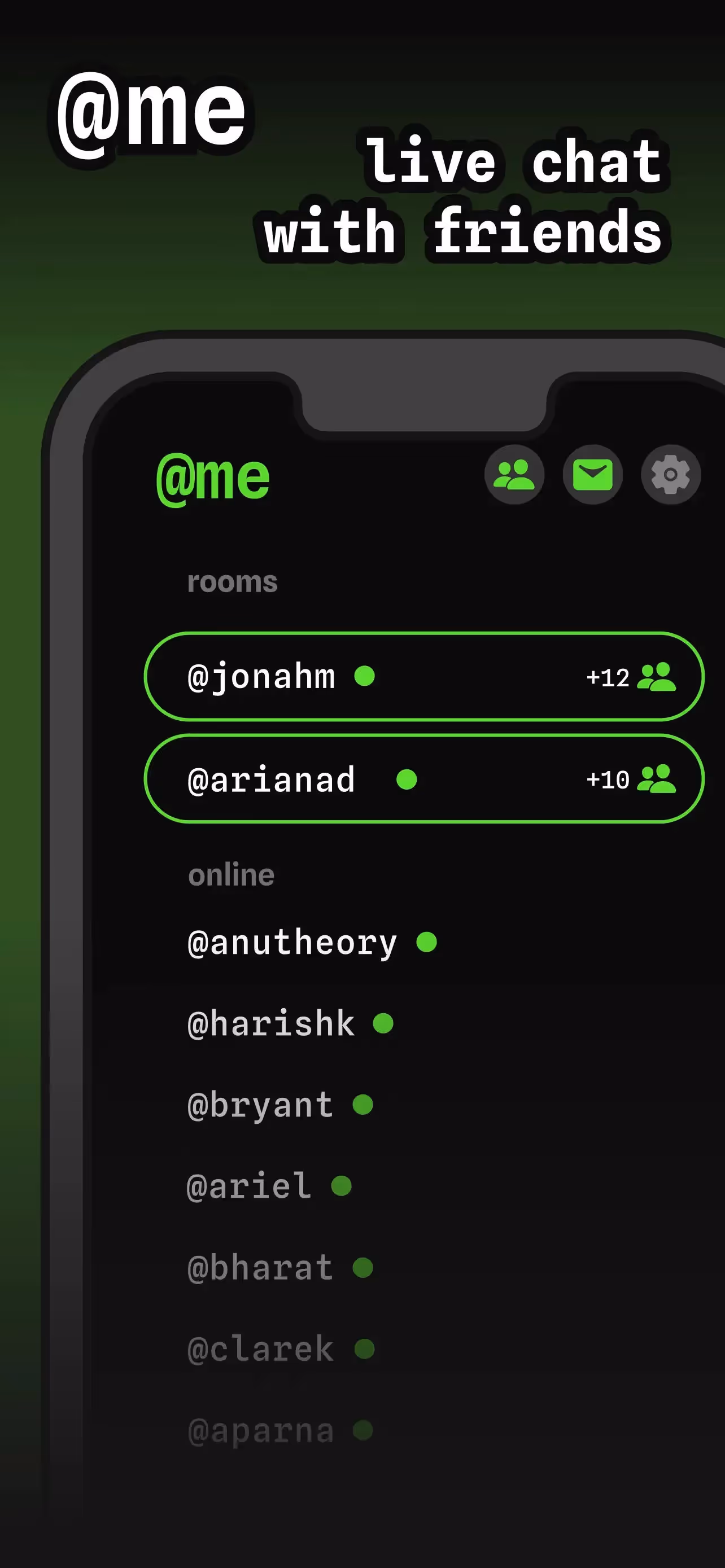 @me - live chat with friends is a Social Networking app developed by Slang Social. Priced at Free, it currently holds a rating of 5.0/5 on the App Store. Browse through its curated screenshots for App Store Optimization (ASO) inspiration, UI design ideas, and to discover effective ways to present a Social Networking app visually.