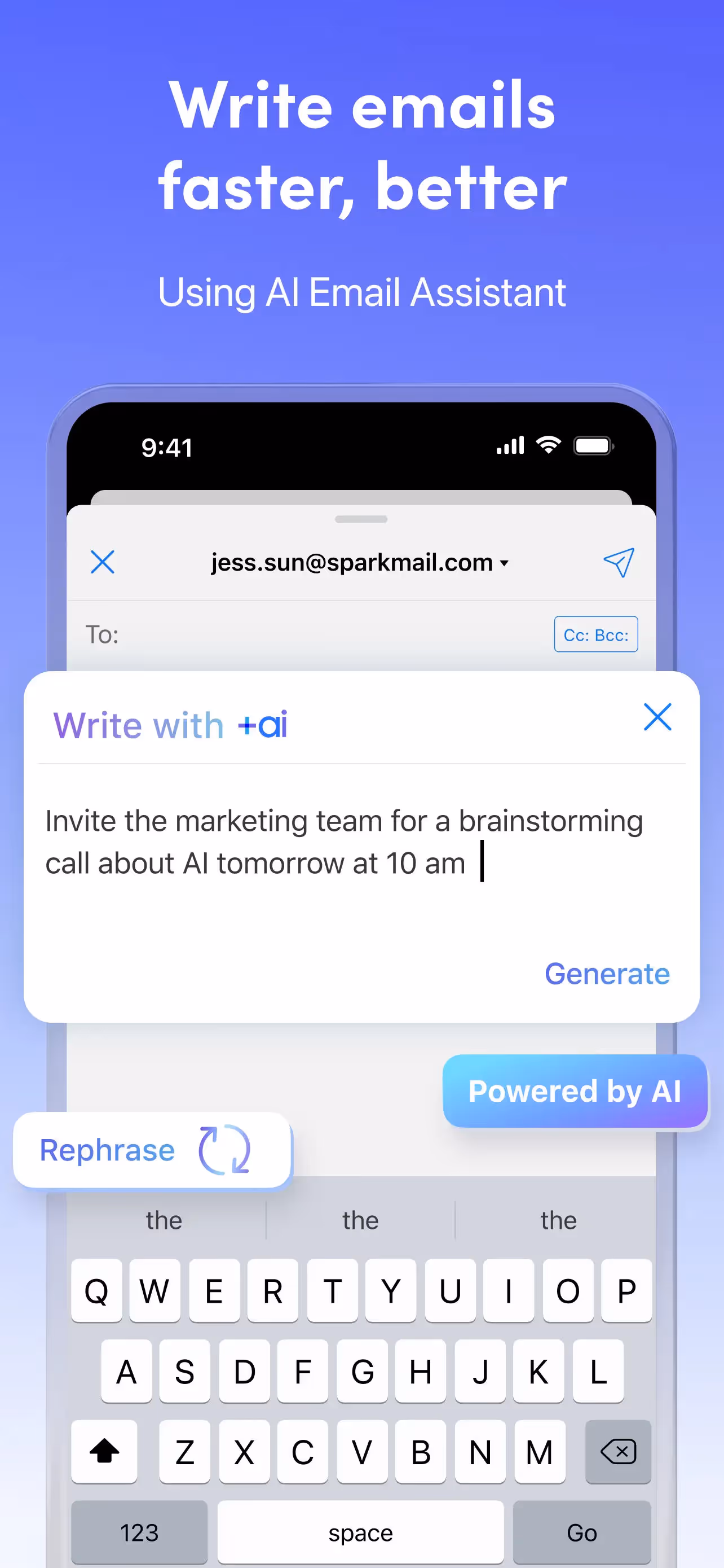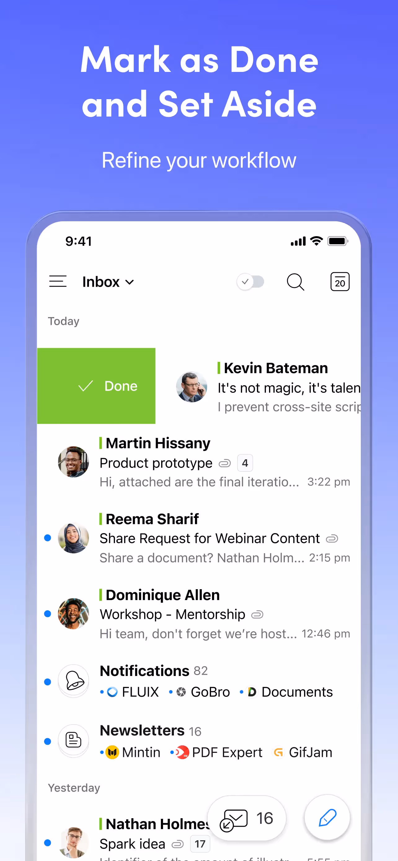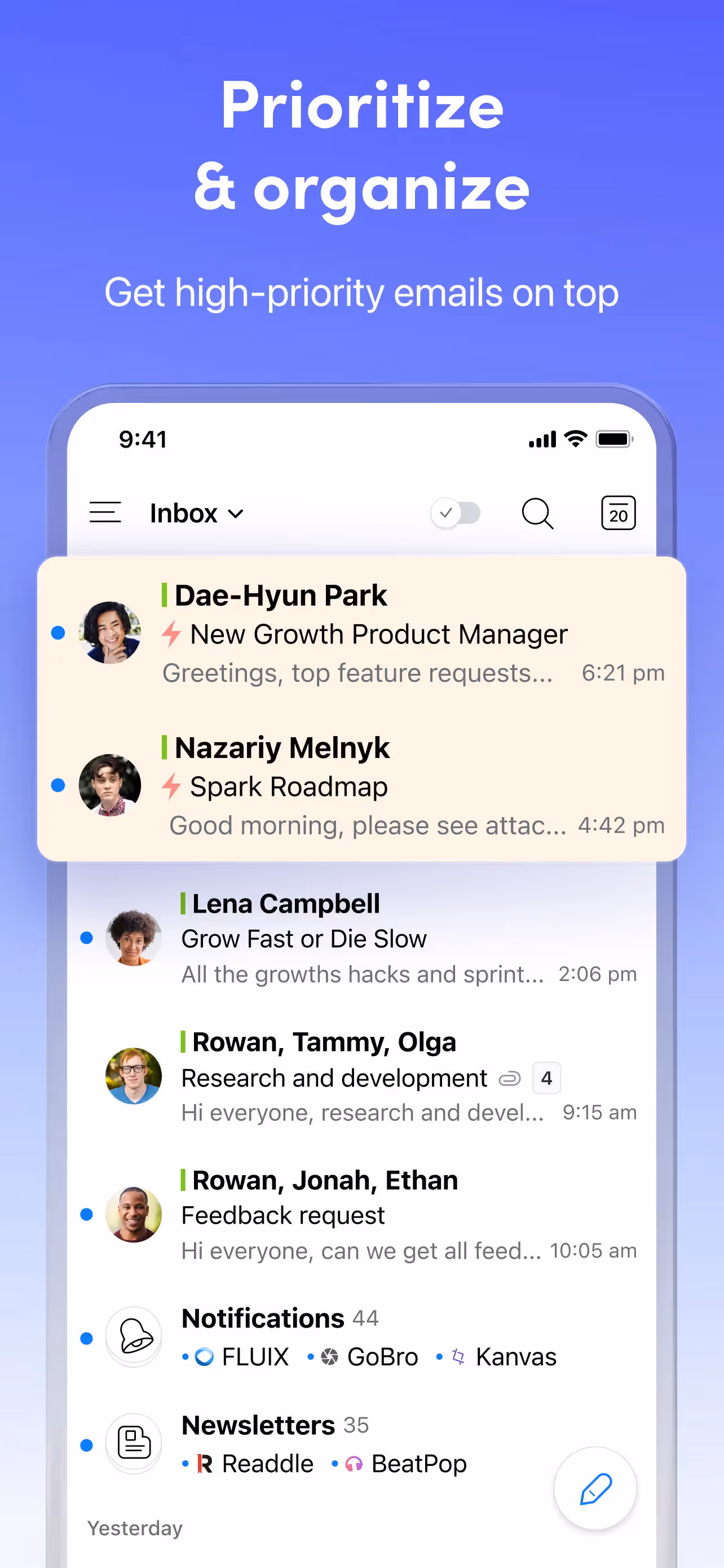 Spark AI Email & Calendar is a Productivity app developed by . Priced at Free, it currently holds a rating of 4.6/5 on the App Store. Browse through its curated screenshots for App Store Optimization (ASO) inspiration, UI design ideas, and to discover effective ways to present a Productivity app visually.