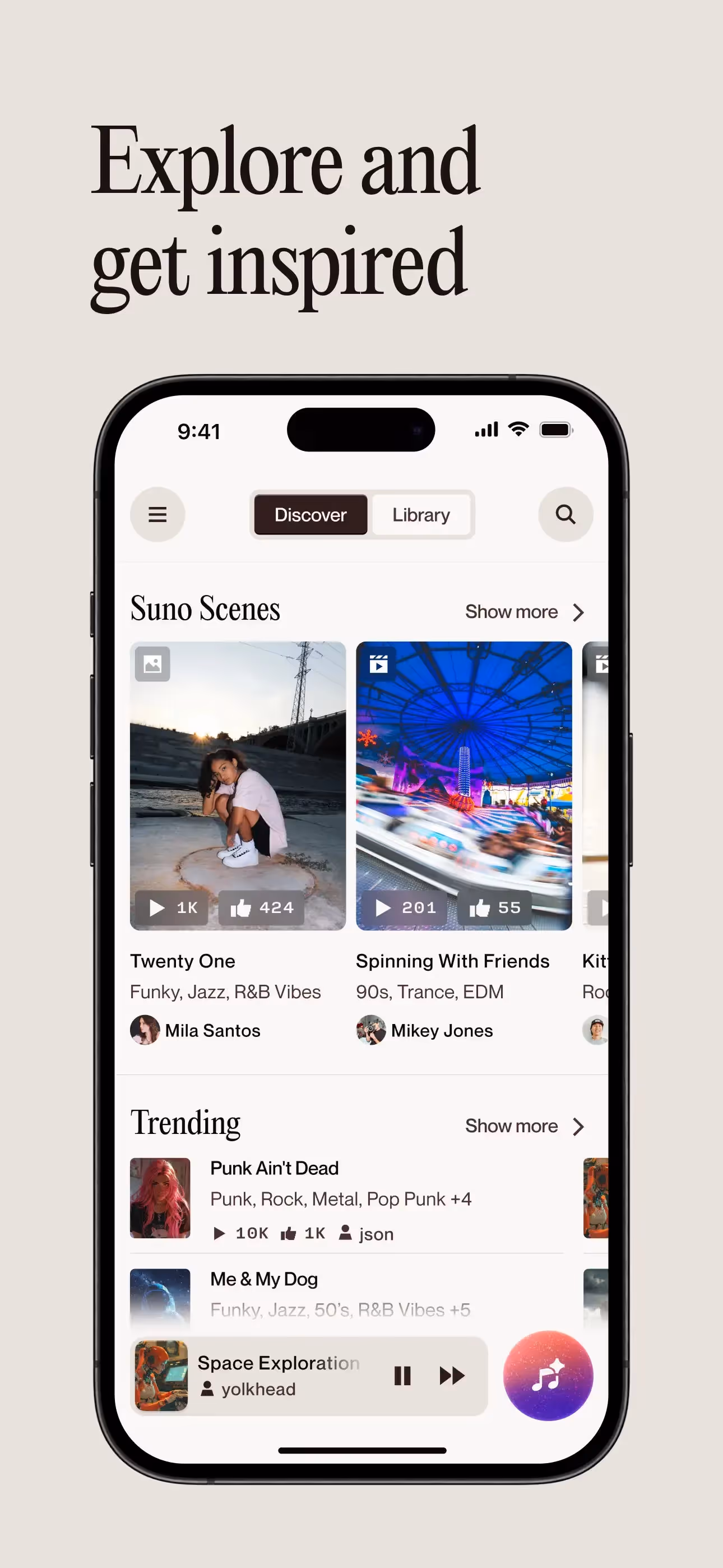 Suno - AI Songs is a Music app developed by Suno, Inc.. Priced at Free, it currently holds a rating of 4.9/5 on the App Store. Browse through its curated screenshots for App Store Optimization (ASO) inspiration, UI design ideas, and to discover effective ways to present a Music app visually.