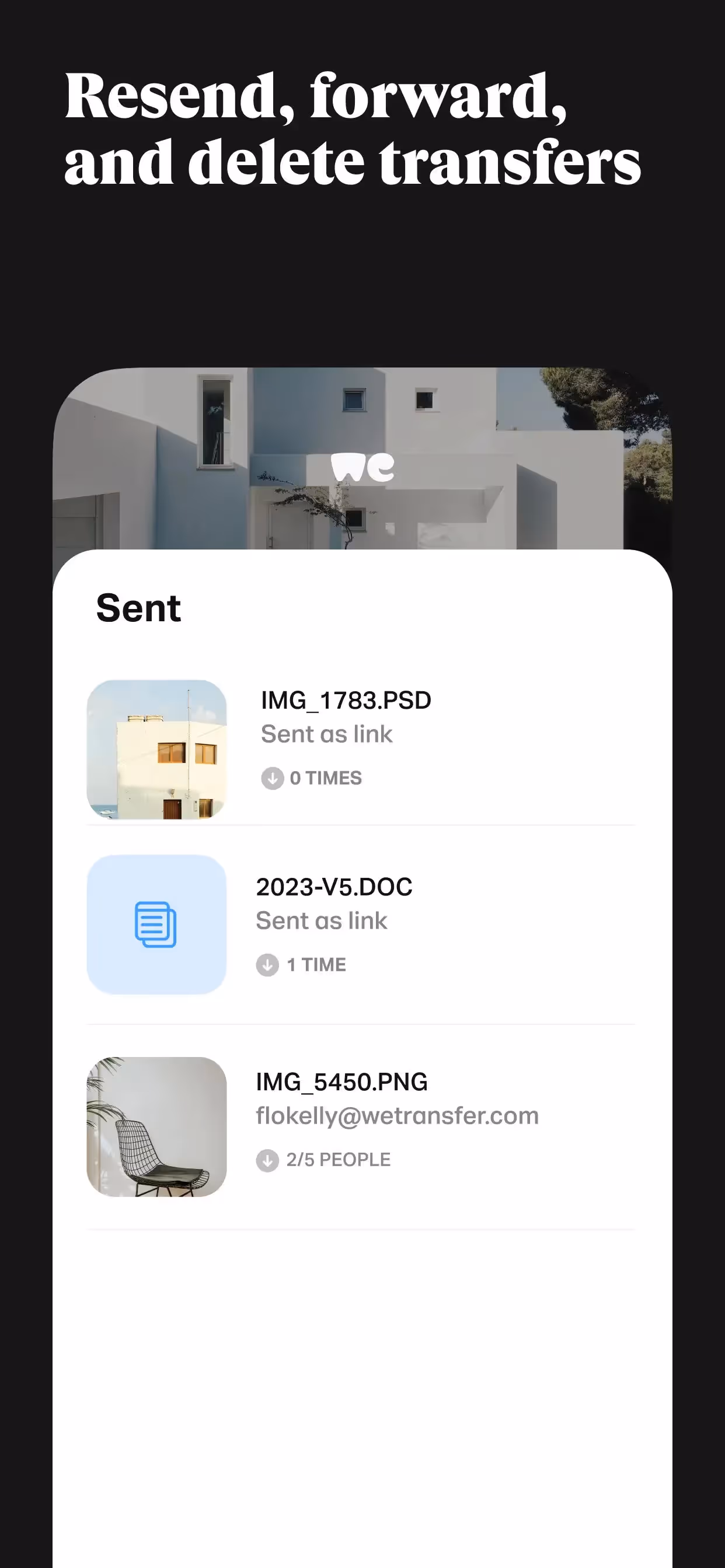 WeTransfer: Transfer Files is a Productivity app developed by WeTransfer BV. Priced at Free, it currently holds a rating of 4.8/5 on the App Store. Browse through its curated screenshots for App Store Optimization (ASO) inspiration, UI design ideas, and to discover effective ways to present a Productivity app visually.